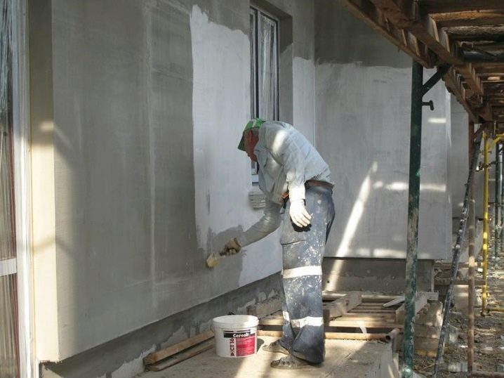 Die Grundierung in Übereinstimmung mit der Technologie sollte bei trockenem Wetter und einer Umgebungstemperatur von etwa +15 Grad durchgeführt werden. Es ist ratsam, die Wände von der Seite zu handhaben, wo kein direktes Sonnenlicht ist.