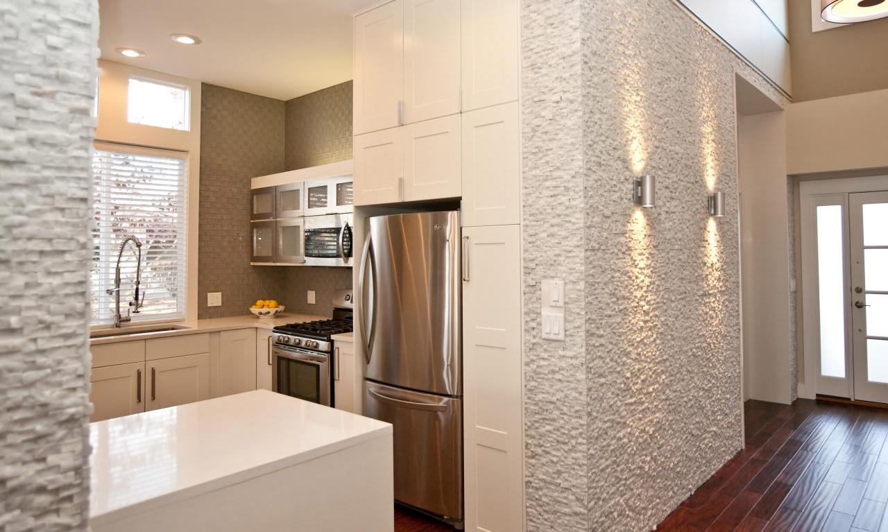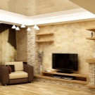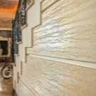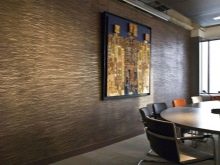 Nicht weniger stilvolle Design-Lösung, übertragen durch das Relief und das Spiel der Farben. Die Beschichtung sieht teuer aus, füllt das Design mit der Atmosphäre von Wohnkomfort.