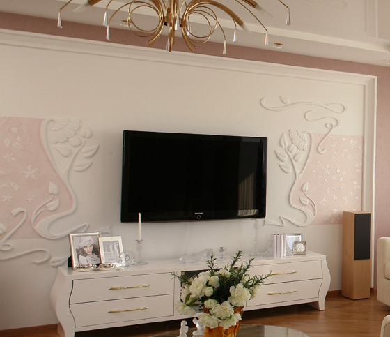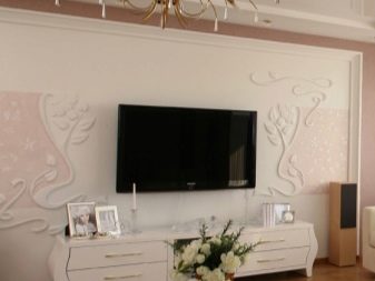 Mit Hilfe eines vorspringenden Reliefs können Sie ein originelles Design in jedem Teil der Wand oder Decke zeichnen, oder zum Beispiel ein Blumenmotiv. Bei Bedarf ist es möglich zu malen - dieser Ansatz erzeugt einen 3D-Effekt. Die Technologie ist die Anwendung der Schablone an der richtigen Stelle und füllt die Schlitze mit Gips.
