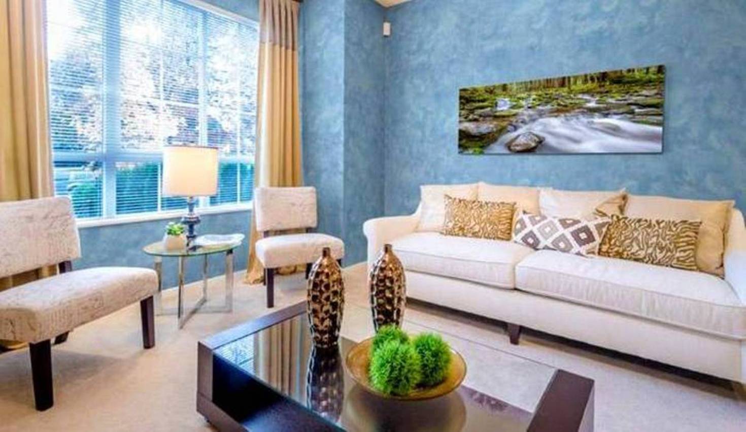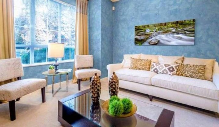 Ein Beispiel für eine vollständige Dekoration des Wohnzimmers. Eine großartige Alternative zu Tapeten und Farben. Fühlt sich frisch und leicht an.