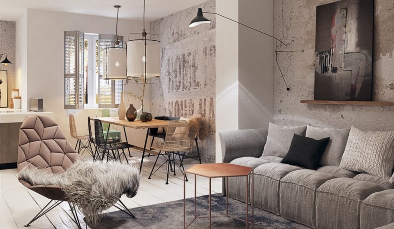 Im Wohnzimmer des ökologischen Stils fügt sich der Texturputz mit einem volumetrischen Muster aus Schablonen harmonisch ein.