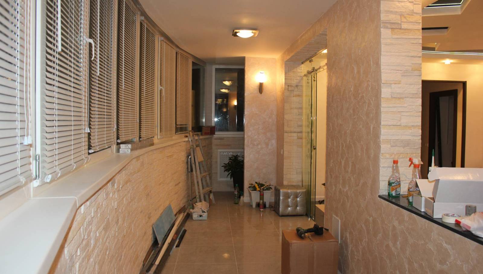 Zum Beispiel sieht eine Rollenmischung harmonisch auf einer Loggia oder einem Balkon aus. Zur gleichen Zeit, Widerstand gegen Temperaturänderungen zu haben, ändert es seine Eigenschaften nicht, behält gut und reißt nicht. Darüber hinaus weisen die Kommentare auf die Möglichkeit hin, einige Arten von Putz zu streichen.