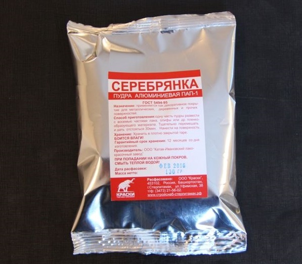Das Rezept besteht aus Anfangs- und Endkitt auf Basis von Pulver, Acrylfarbe und dem üblichen Silberpulver. Das Verhältnis der Komponenten beträgt 1: 1. Die Silbermünze wird verwendet, nachdem die texturierte Oberfläche getrocknet ist.