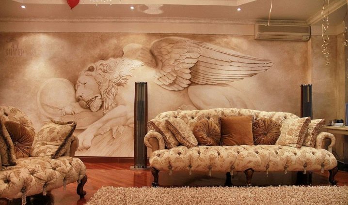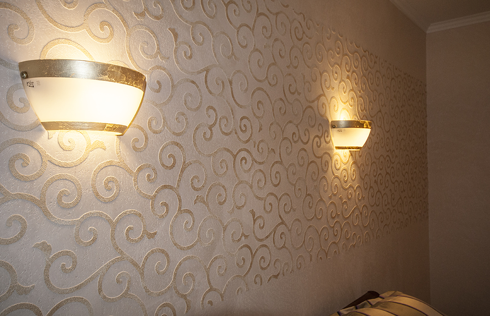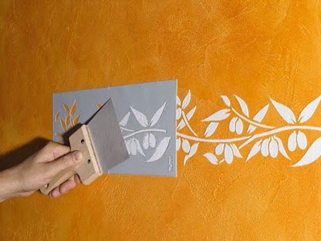 Die beste Art der Dekoration der fertigen Oberfläche ist die Verwendung von Schablonen über dem Hauptmuster. Mit dieser Technik können Sie den Wänden oder der Decke einen besonderen Effekt verleihen. Die Beschichtung wird zum "Highlight" jedes Interieurs.
