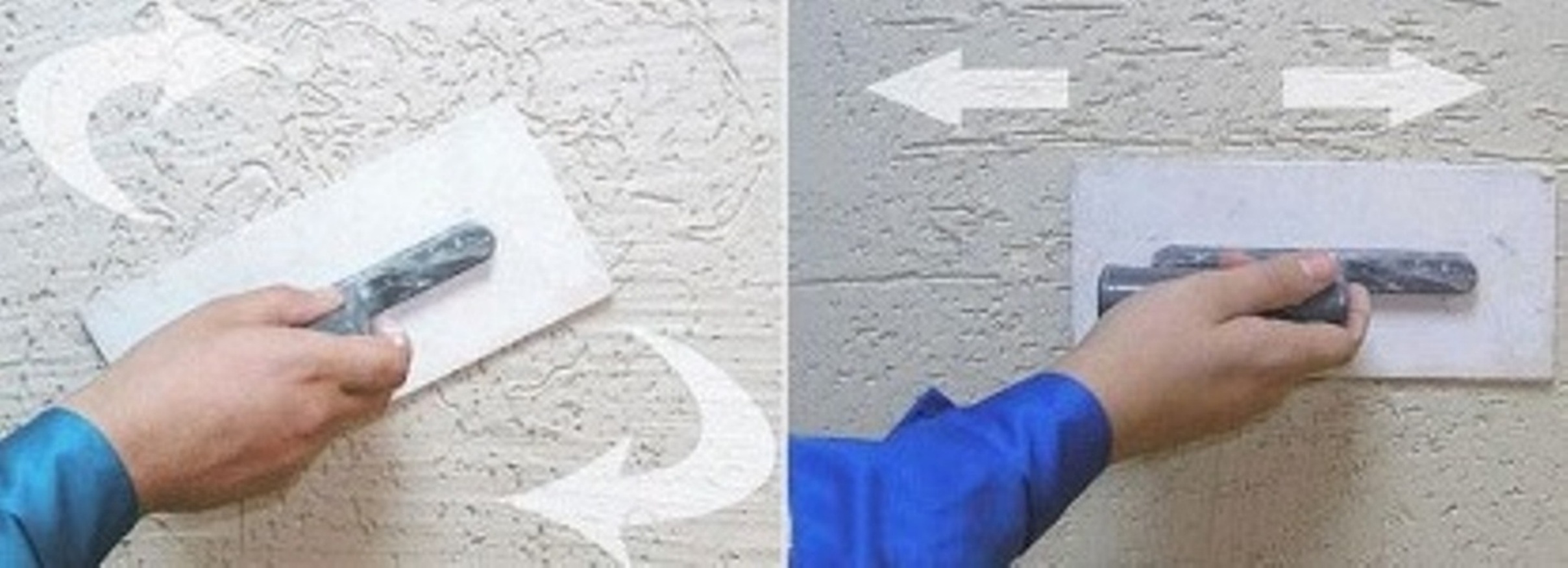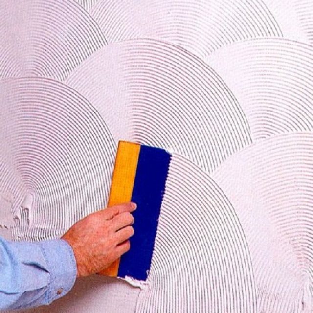 Mit einem Spatel werden Wellen, Zickzacks und die Nachahmung von Ziegeln, Marmor und Stein ausgeführt. Je nach Art des Musters können die Bewegungen gerade, bogenförmig oder chaotisch sein.