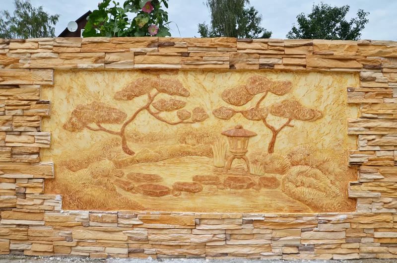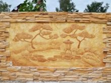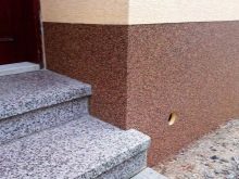 Mosaikputz ist eine Komposition von glasiger Optik, die Basis sind transparente Harze, kleine Steine (Granit, Marmor, Dolomit, etc.) wirken als Füllstoff. Solche Dekoration wird den Keller des Gebäudes, Hänge und Geländer schmücken.