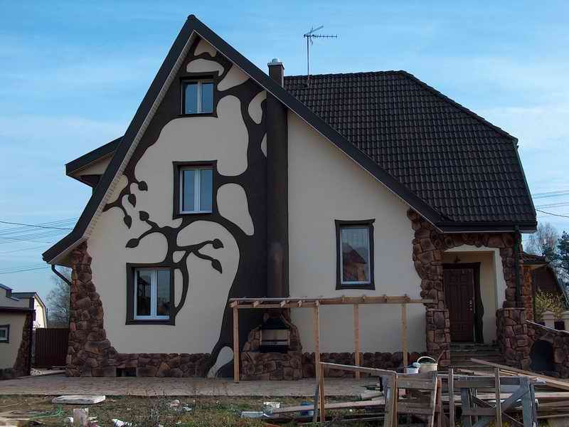 Die Verkleidung der Fassaden in Form eines "Mantels" aus Gips wird seit langem verwendet, hat aber bis heute nicht an Popularität verloren. Die Wirkung von "Pelz" wird auf der Oberfläche durch die Verwendung von speziellen Walzen erzielt. Der Prozess der Anwendung ist nicht zu kompliziert und ziemlich fähig für Anfänger. Heute werden dem Verbraucher haltbarere und ästhetisch ansprechendere Mischungen angeboten als noch vor zehn Jahren, auf der Basis von Zement mit verschiedenen Additiven sowie auf der Basis von Silikon- oder Acrylharzen. "Pelzmantel" sieht in der Farbe gut aus. Um dies zu tun, können Sie in einer weißen Mischung eine andere Farbe hinzufügen oder Farbe nach dem Trocknen der Oberfläche auftragen.