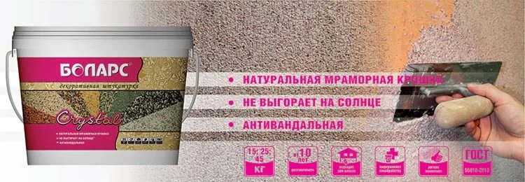 Die Kosten für ein Paket mit einem Gewicht von 11,5 kg betragen etwa 450 Rubel. Diese Firma bietet auch Dekorputz: "Stein" und "Borkenkäfer".25 kg weißer "Kameshkovoy" Gips "Bolars" kostet etwa 550 Rubel.