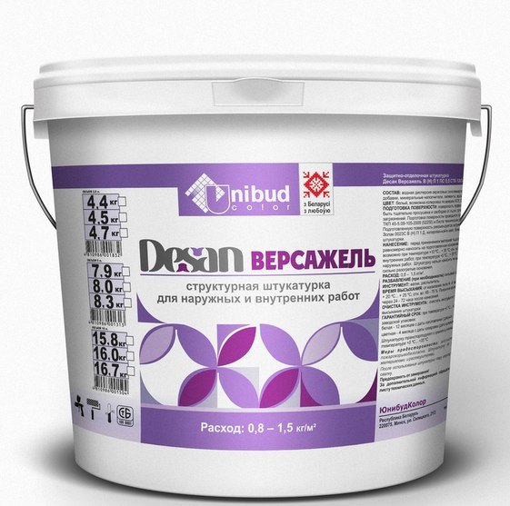 Bravo Unternehmen. Decor produziert auch verschiedene Putzmischungen für Fassaden und Sockel. Unter ihnen steht die aufgesprühte Acryl-Mischung "Versaille", die als Vandalen-Beschichtung positioniert ist. Der Hersteller behauptet, dass diese Zusammensetzung keine sorgfältige Oberflächenvorbereitung erfordert, sie ist flexibel und deckt kleinere Unregelmäßigkeiten und Risse ab. Die Kosten eines Behälters mit einem Gewicht von 15 kg betragen 2,5 Tausend Rubel.