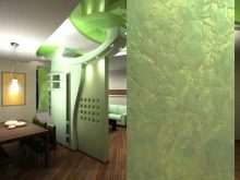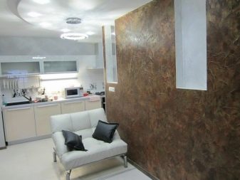 - Für die Gestaltung einer Studio-Wohnung ist es notwendig, gründlich über die Reparatur nachzudenken, da die Wandverkleidung in der Wohnküche zusätzlichen negativen Einflüssen ausgesetzt ist. In diesem Fall müssen Sie Orte für die Erholung und die Aufnahme von Nahrungsmitteln in Zonen aufteilen.Ein venezianischer, mit Gips gesättigter dunkler Schatten, etwas, das an Leder erinnert, wird dieser Aufgabe perfekt gerecht.