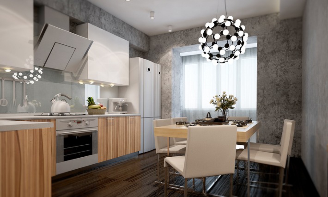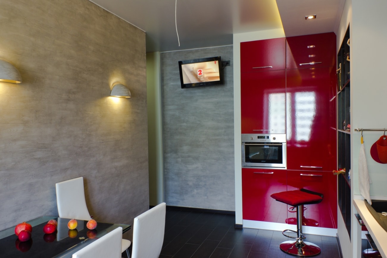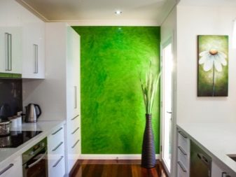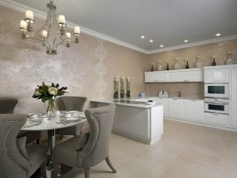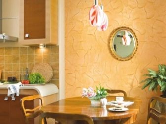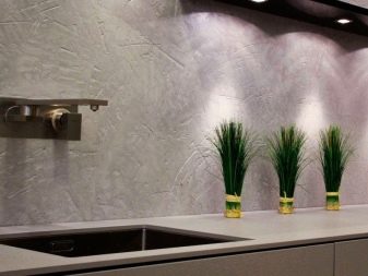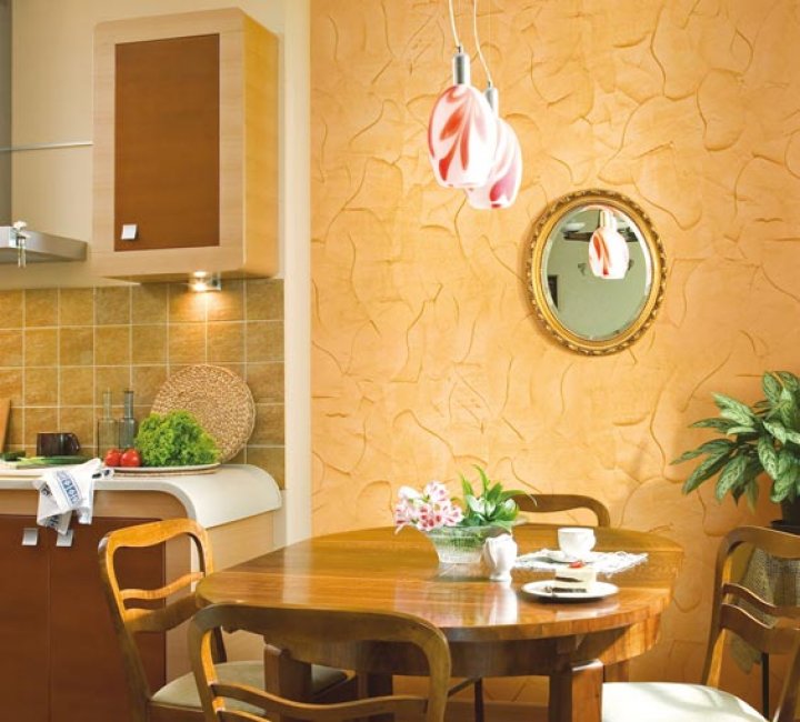 Die Küche ist einer der attraktivsten Orte für Dekoration mit dekorativem Putz. Dies ist ein Raum, in dem die Familie und insbesondere die Hausherrin viel Zeit verbringen. Daher sollte das Zimmer schön, modern eingerichtet sein, ein Gefühl von Frieden, Komfort und Komfort für alle im Haus lebenden Menschen hinterlassen.