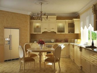 - Milch-Beige-Farben eignen sich für klassische Interieurs. Sie können auch die Decke abschließen. Diese Rezeption wird Ihrem Esszimmer einen besonderen Glanz verleihen.