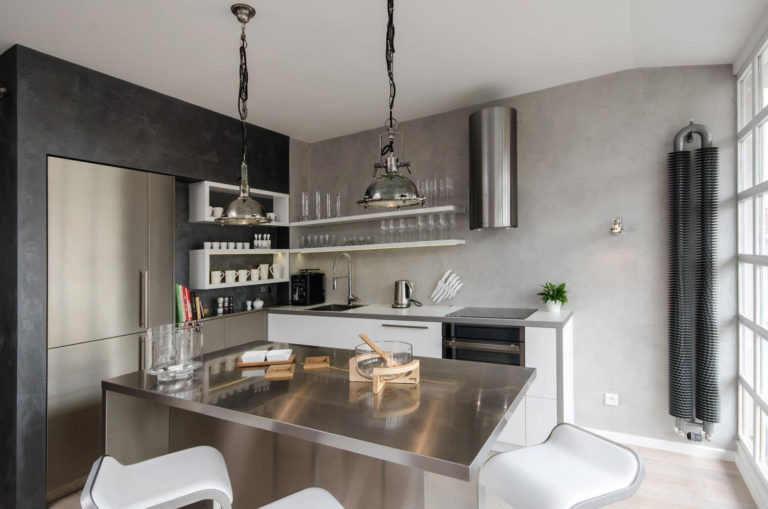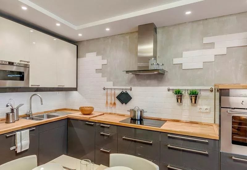 - Design aus Holzimitat oder Beton ist charakteristisch für den industriellen Stil. Die tiefe graue Farbe, die das raue Ende akzentuiert, wird die lakonische weiße Kücheneinheit ausgleichen.