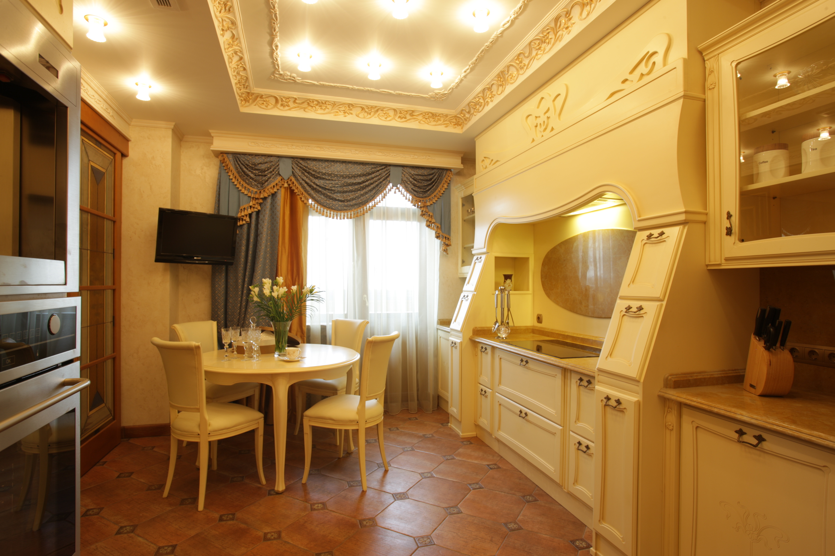 - Klassisch gemusterte Möbel, Vintage-Lampen, eine Fülle von Vergoldungen in Beschlägen und ein Kristall-Kronleuchter werden die verputzten Wände mit goldenen Tönen perfekt ergänzen.