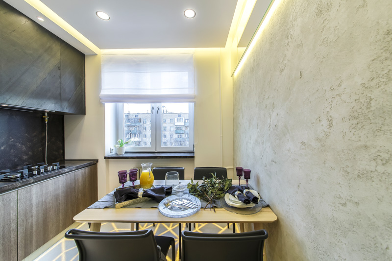 - Bewertungen von zahlreichen Verbrauchern, die diese Art von Dekoration bereits in Anspruch genommen haben, sagen, dass eine gleichmäßige Beschichtung der Wände oder der Decke sehr wichtig ist. In der Küche ist dieses Plus besonders relevant: Fett und Schmutz gelangen mit der Zeit in die Fliesenfugen, der Fugengrund verdunkelt sich und ist schwer zu reinigen. Sie können nicht einmal über Tapeten sprechen: Sie sind hart genug, um zu kleben, so dass die Gelenke nicht sichtbar sind, und bei häufigen Gebrauch und Interaktion mit mechanischen Reizen können die Kanten der Blätter beginnen wegzuziehen. All dies lässt es schlampig, chaotisch und unordentlich aussehen. Nahtlos verputzte Oberfläche gibt die Integrität und Vollständigkeit des Gesamtbildes.