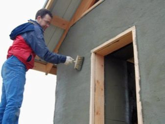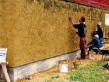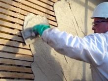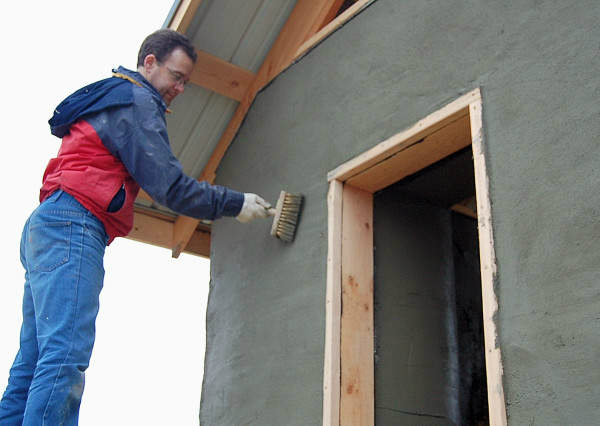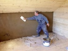 Zu diesem Zeitpunkt müssen Sie alle Tropfen und Stöße entfernen. Es müssen Arbeiten gemacht werden, die sich vom oberen Teil der Überlappung aus bewegen. Bei dieser Anwendung wird die Mischung im unteren Teil der Holzwände bei der Entwässerung keine überschüssige Feuchtigkeit aufnehmen.Wenn auf dem getrockneten Spray kleine Risse sind, können Sie diese mit einer Grundierung entfernen. Die Dicke seiner Schicht kann 7 mm betragen.