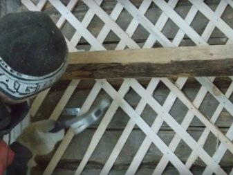 Um alle Details zu beheben, können Sie gewöhnliche Nägel verwenden. Wie für die Befestigung von Schindeln, sollte es an den Enden und im zentralen Teil der sich kreuzenden Elemente durchgeführt werden. Es ist sehr wichtig, 3 mm Lücken zwischen den Lamellen zu lassen. Dies ist notwendig, um unnötige Verformung während der Expansion zu vermeiden. Trockene Schindeln können an den Stellen benetzt werden, an denen sich die Nägel befinden, so dass das Massiv nicht reißt.