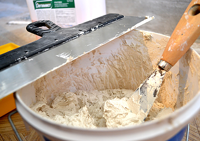 Danach kannst du zum Spray gehen. Es besteht darin, Gipslösung auf die Holzbasis zu setzen. Um die Mischung zuverlässiger und von hoher Qualität zu machen, können Sie PVA-Kleber hinzufügen. Vorbereitung der notwendigen Ausrüstung beginnt mit einer Kelle oder Kelle. Mit ihrer Hilfe wird es zweckmäßig sein, eine erste Putzschicht mit einer Dicke von 1 cm aufzutragen.
