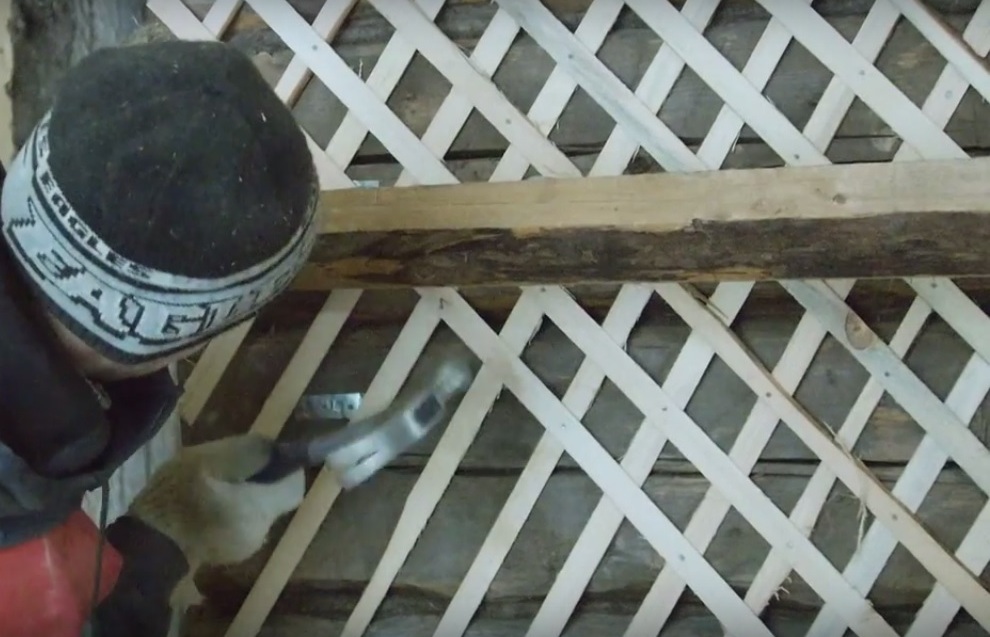 Der nächste Schritt an den Wänden ist die Installation eines Schindelgitters, das aus zwei sich kreuzenden Lamellen besteht. Streifen müssen der Reihe nach geschlagen werden, indem sie sich in einem Winkel von 45 Grad vom Boden bewegen. Zwischen den Lamellen müssen Sie eine Lücke von nicht mehr als 5 cm lassen.
