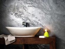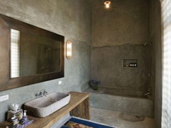 Denken Sie an diese Eigenschaft von Betonputz, als erhöhte Beständigkeit gegen Feuchtigkeit und Temperaturänderungen. Solches Material wird als der Anfang der Schaffung eines neuen stilvollen Badezimmers dienen. Kristall-weiße glänzende Installation wird mit rauhen Betonwänden gut aussehen.