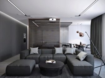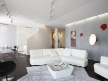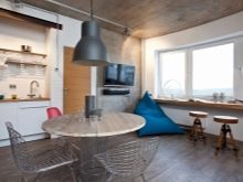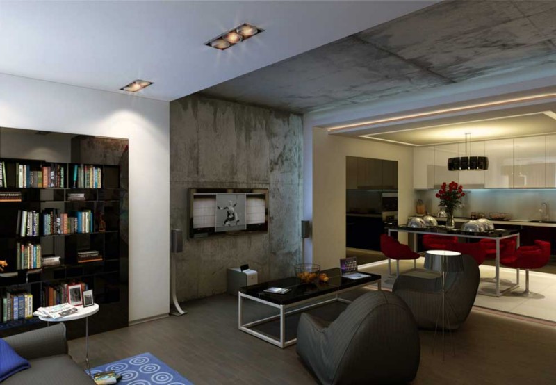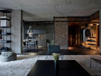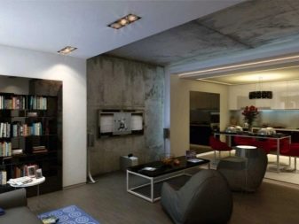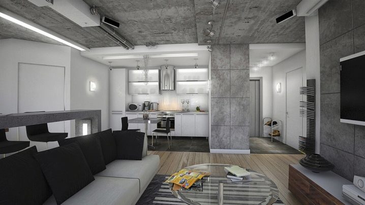 Wohnzimmer, im Stil von Loft gemacht, wird das interessanteste und attraktivste Objekt Ihres Hauses sein. Zum Beispiel wäre eine authentische Wand, die mit Gips unter Beton bedeckt ist, ein ausgezeichneter Hintergrund für einen riesigen Fernseher oder strenge klassische Gemälde. Die Betonoberfläche in der Küche wird harmonisch mit dem Küchenset anstelle von gewöhnlichen Fliesen aussehen. Und Sie können auch eine Tischplatte hinzufügen, die Beton nachahmt - dies wird perfekt mit den Wänden kombiniert. Vergessen Sie nicht, dass es in einem so strengen Innenraum wichtig ist, Elemente der Zartheit in Form einer Vase mit weißen Blumen, ein gemütliches Sofa mit Kissen, sowie klassisches Geschirr hinzuzufügen.