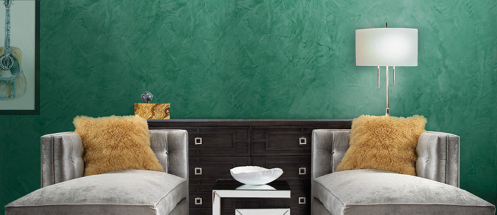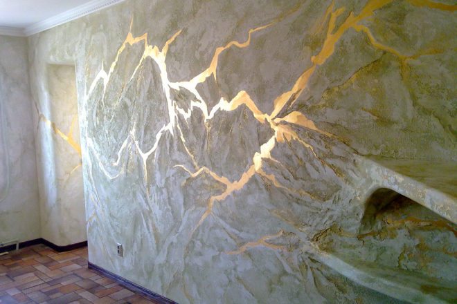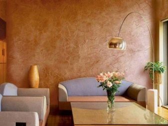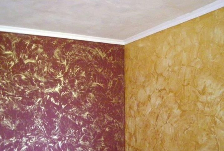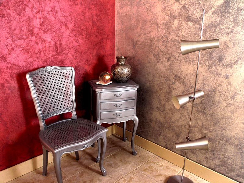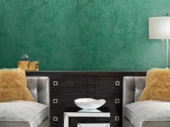 Es ist möglich, strukturierte Wände mit der Wirkung von venezianischem Putz zu streichen. Die Basisschicht wird nach der üblichen Methode der Beschichtung in einer Farbe hergestellt. Der zweite Farbton ist mit einem metallischen Glanz aufgenommen.zum Beispiel auf der Basis von Silber- oder Aluminiumpulver.