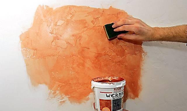 Natürliches oder synthetisches Wachs kann Pigmente enthalten, die gesättigte Farben ergeben. Dann ist die Grundfarbe nicht erforderlich - man ist genug. In flüssiger Form wird es mit einem weichen Tuch oder Gummispachtel auf strukturierte Wände aufgetragen. Die verschiedenen intensiven Schattierungen, die auf das Licht gegossen werden, erweisen sich.
