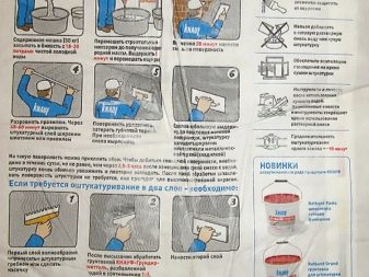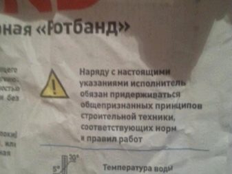 Bevor Sie die Arbeitslösung vorbereiten, lesen Sie unbedingt die Anweisungen auf der Rückseite der Tasche mit Rotband. Eine Packung mit 30 kg Füllmasse benötigt ca. 18 Liter Flüssigkeit.Um die Mörtelmischung zu kneten, wird ein erforderliches Volumen an Wasser in einen geräumigen Tank gegossen und Pulver wird in Teile gegossen, wobei der Inhalt mit einem Konstruktionsmischer vermischt wird, um eine homogene Masse ohne klumpige Einschlüsse zu erhalten.