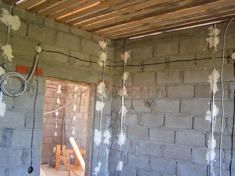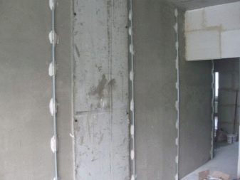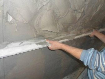 - Installation von Beacons. An einer Wand mit einer Teilung von 0,3 m werden vertikale diskontinuierliche Streifen aus einzelnen Skulpturen aus einer dicken Mörtelmischung geformt, die dann zu Bakenprofilen gepresst werden.Dann sind sie in einer Ebene ausgerichtet.