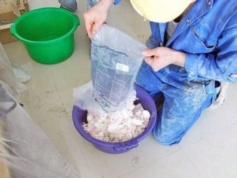 Falls erforderlich, ist die trockene Mischung zulässig, um in den Tank zu gießen, Sie können auch Wasser hinzufügen. Nach dem Zugeben der Komponenten zu der Lösung, warten Sie 5-6 Minuten, lassen Sie es reifen, und mischen Sie dann schließlich die Gipsmasse. Es lohnt sich, dies zu beachten direkt bei der Arbeit mit Gips, ist ein Teil der Zugabe von Pulver oder Wasser in die Mörtelmischung absolut inakzeptabel.