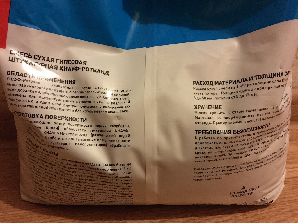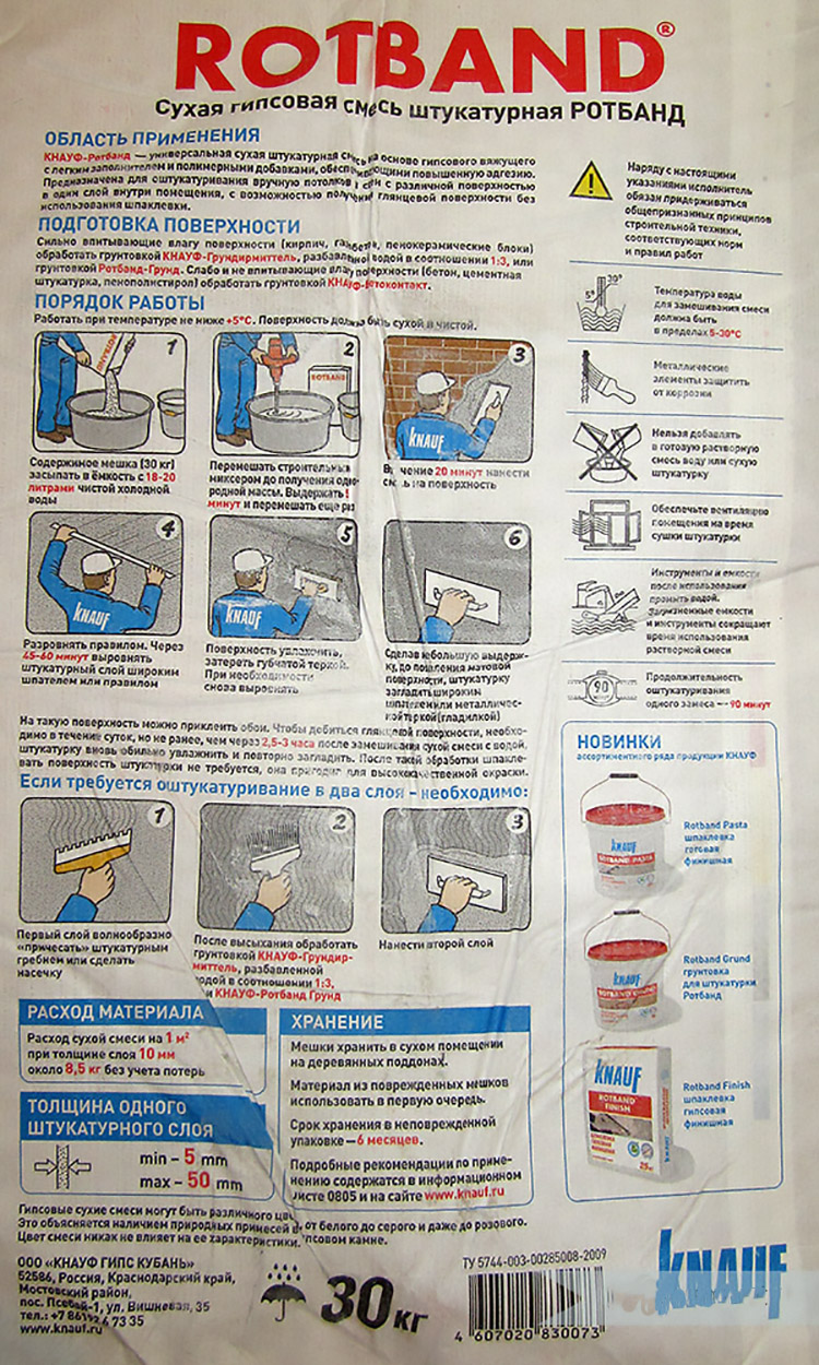 - Im Gegensatz zu Zementputzmischungen wiegt Rotband viel weniger, daher ist die Belastung der behandelten Oberflächen geringer. Aufgrund des geringen Gewichts ist es einfacher und billiger, es zu transportieren.