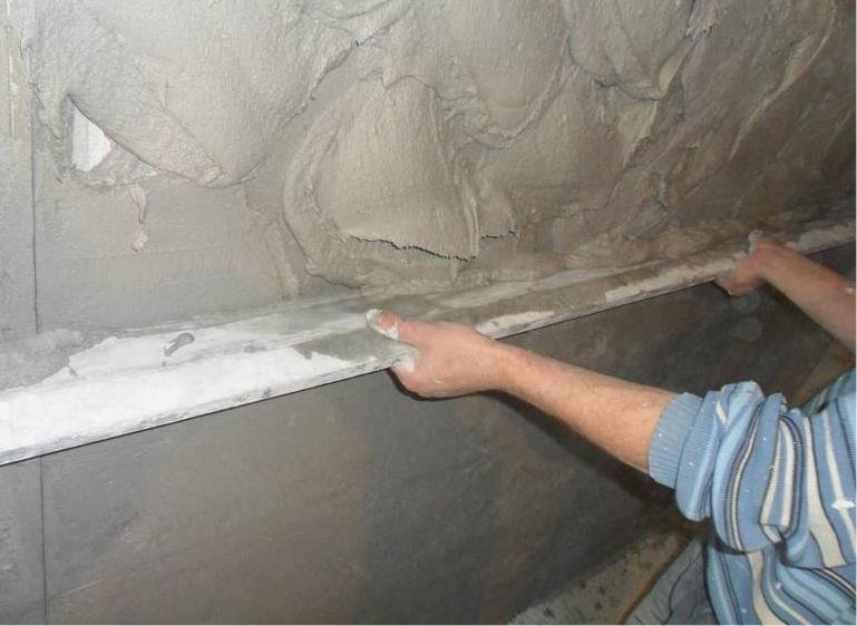Wie bereits erwähnt, ist es wichtig, in einer bestimmten Zeit eine Mörtelmischung zu verwenden - maximal 25 Minuten nach der Zubereitung. Die Deckenfläche wird mit einem Falken verputzt - ein Konstruktionswerkzeug in Form einer quadratischen Plattform aus Holz, Metall oder Polyurethan, die mit einem Griff ausgestattet ist. Sie können auch die Wände des Rotbandes mit einem Konstruktionsfalken verputzen oder den Mörtel mit einer Kelle werfen, danach können Sie die Skulpturen mit einer Regel nivellieren, so dass Sie eine flache Oberfläche bekommen.