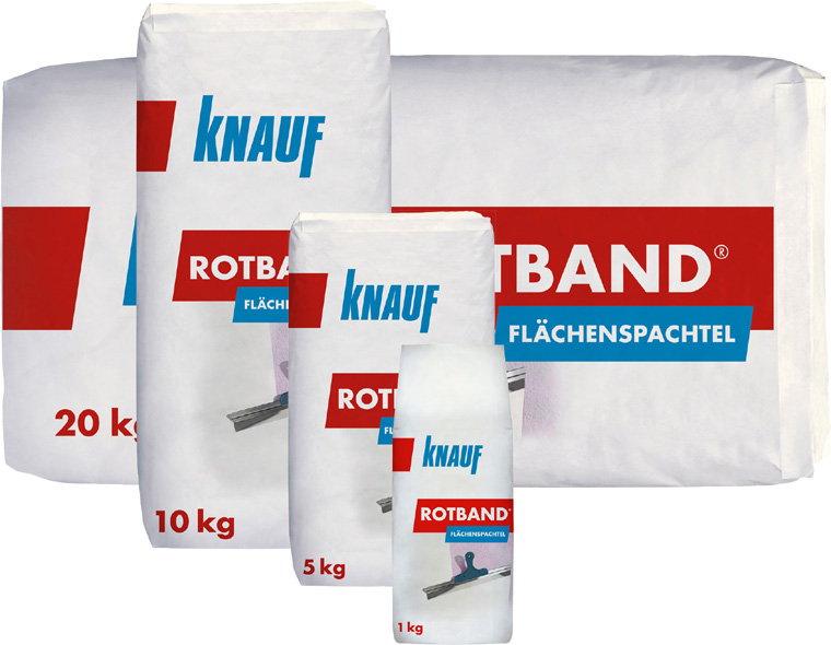 - Dünnschicht-Spachtelmassen sind Knauf Rotband Finish und Knauf Rotband Pasta Profi-Spachtelmassen, die zur Oberflächenvorbereitung für dekorative Oberflächen verwendet werden.
