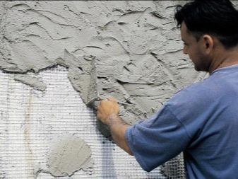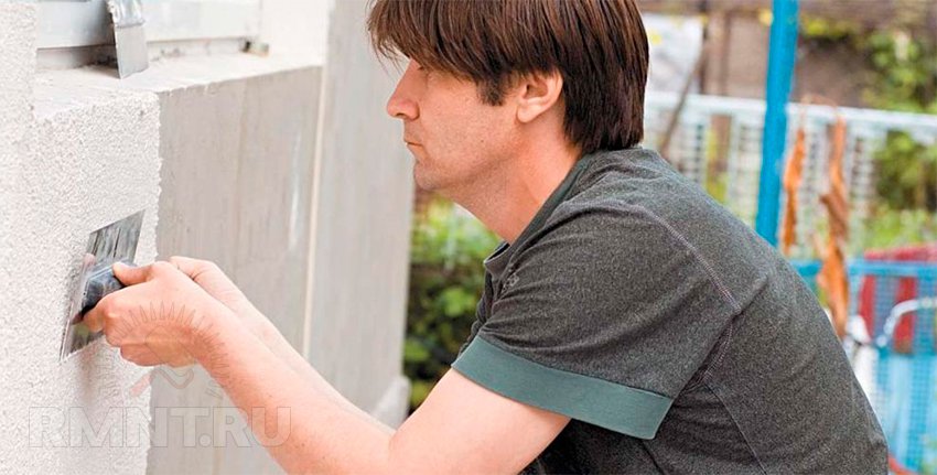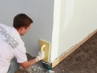 Wenn die Fundamente aus expandiertem Polystyrol oder Zement hergestellt sind, müssen sie zwingend bearbeitet werden, und das Bewehrungsnetz sollte mit Gips beklebt werden. Es muss auch korrekt installiert werden. Dies geschieht mit Hilfe von PVA-Leim oder einer dünnen Putzschicht, auf die das Element geklebt wird. Das Gitter sollte eingedrückt und gründlich geglättet werden, dann verputzen, grundieren und trocknen. Next ist bereits Putzmischung Rotband aufgetragen.