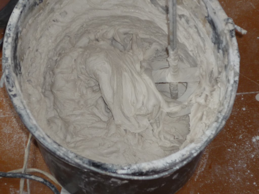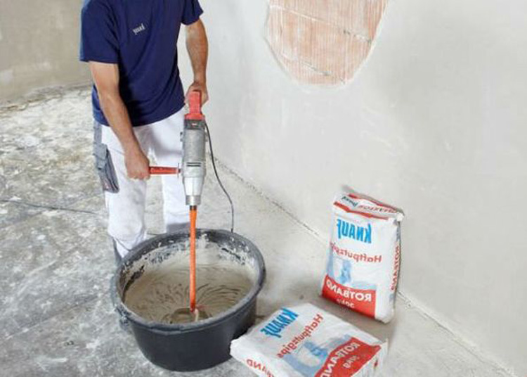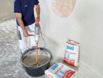 Es ist sehr wichtig, die Komposition mit einer angemessenen Geschwindigkeit anzuwenden, da sie ziemlich schnell austrocknet. Experten empfehlen, die Mischung nicht in großen Mengen zu verdünnen.Für das beste Ergebnis des Mischens können Sie sowohl einen Konstruktionsmischer als auch einen Bohrer mit einer speziellen Düse verwenden. Die Konsistenz des Putzes sollte einer dicken Creme ähneln. Um die Qualität der Zusammensetzung nach dem Mischen zu verbessern, sollte es 10 Minuten lang brühen gelassen werden, dann erneut mischen und erst dann zur Arbeit übergehen.