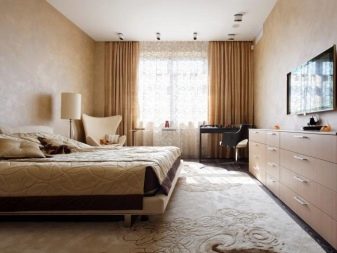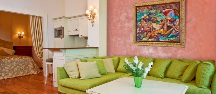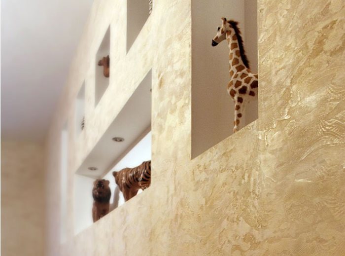 Mit Hilfe von Seidenputzputz können Sie Räume zonieren: z. B. Arbeitsbereiche oder Plätze zum Ausruhen zuweisen. Die Farbe des ausgewählten Putzes sollte sich von den anderen Farbtönen im Raum unterscheiden. Solche Materialien sind für eine Vielzahl von Räumen geeignet, aber es sollte beachtet werden, dass sie Flüssigkeit stark absorbieren.