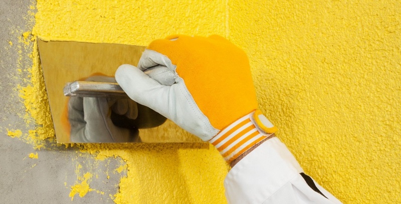 - Mit einer Kelle den Putz auf die Oberfläche auftragen. Es wird empfohlen, eine kleine Menge Material zu nehmen, da es ziemlich flüssig bleiben muss.