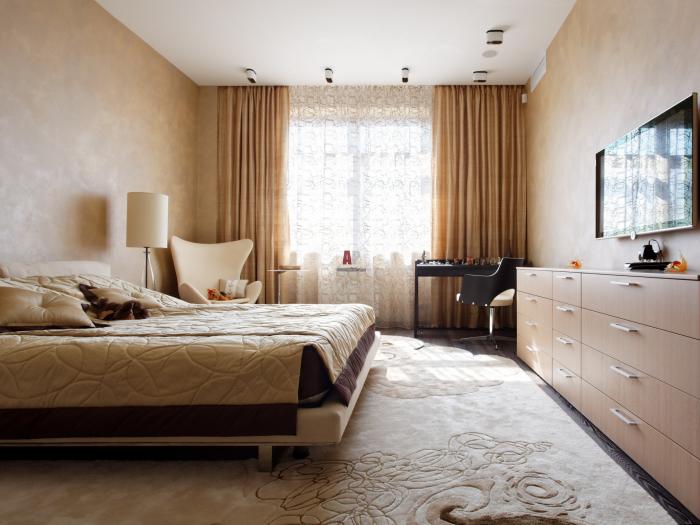 - Seidenbezüge von hellen Farbtönen sind ideal für Schlafzimmer - Räume, die für Entspannung, Ruhe bestimmt sind. Das Bild an der Spitze des Raumes verleiht dem Raum zusätzlichen Schwung.