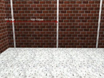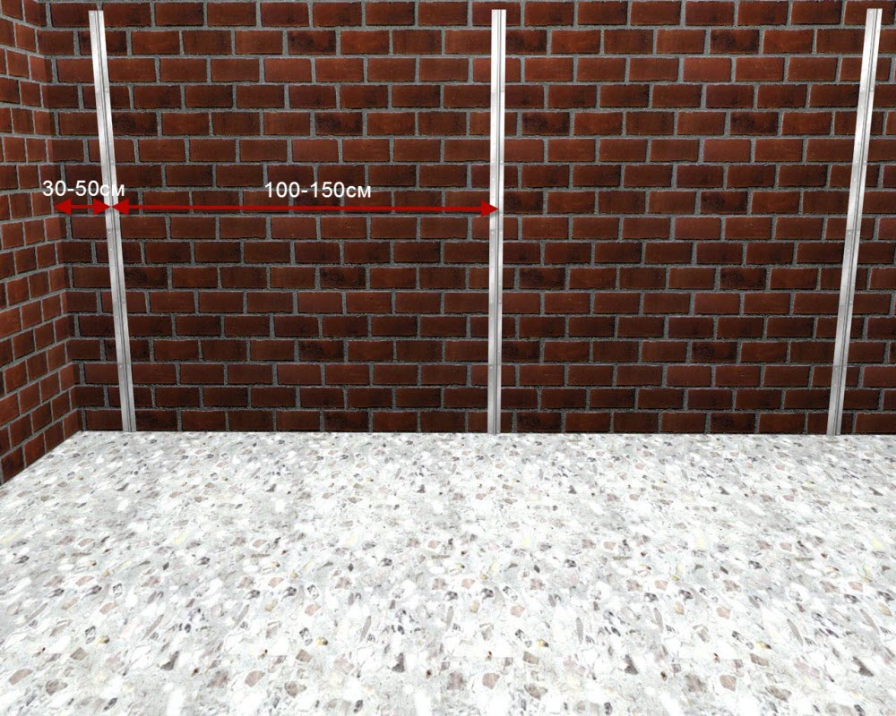 Zeichnen Sie als nächstes einen vertikalen Streifen auf die Basis. Wenn Sie eine Regel mit einer Länge von 2 m haben, sollte der Abstand zwischen den Baken ungefähr 160 cm betragen, dann können Sie mit der horizontalen Markierung fortfahren. Machen Sie einen Abstand vom Boden von 15-18 cm, zeichnen Sie eine Linie, die senkrecht zu den vertikalen Markierungen ist.