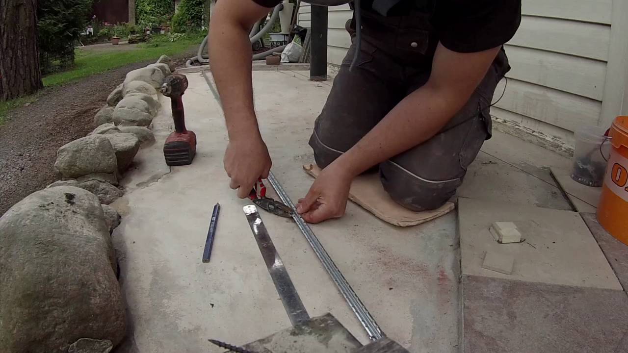 - nach dem Einstellen der Baken und dem Anbringen der horizontalen Streifen Löcher bohren, dabei einen Abstand von 30-35 cm für die Dübel einhalten;