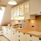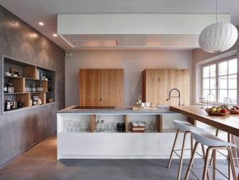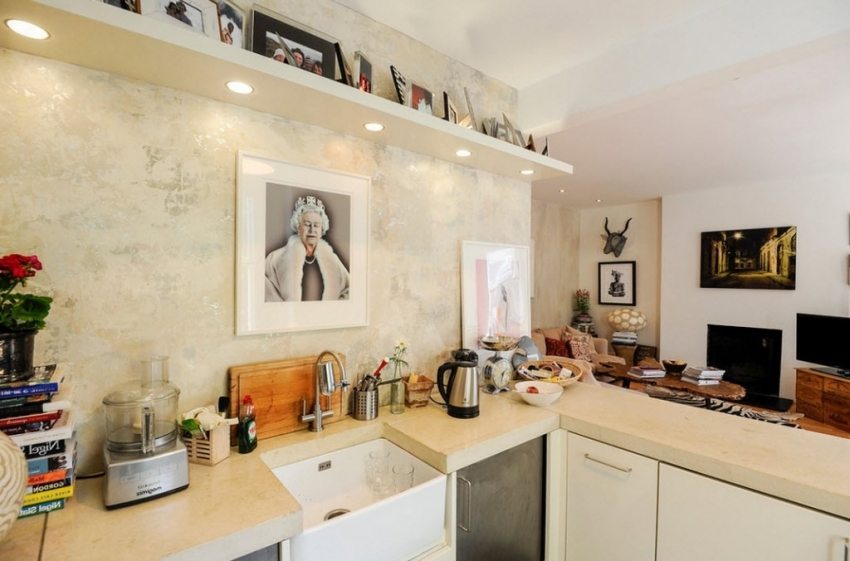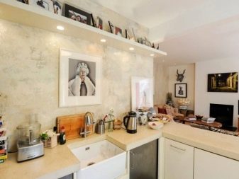 Feuchtigkeitsbeständigkeit und Dampfdurchlässigkeit von venezianischem Gips sowie die Fähigkeit, die Beschichtung (einschließlich Seifenlösung) zu waschen, bewirken eine aktive Verwendung des Materials in der Küche. Für große Räume empfiehlt es sich, reliefartige und texturierte Beschichtungen zu wählen, für kleine Küchen - feinkörniger Putz, Farben - im Ermessen des Benutzers.
