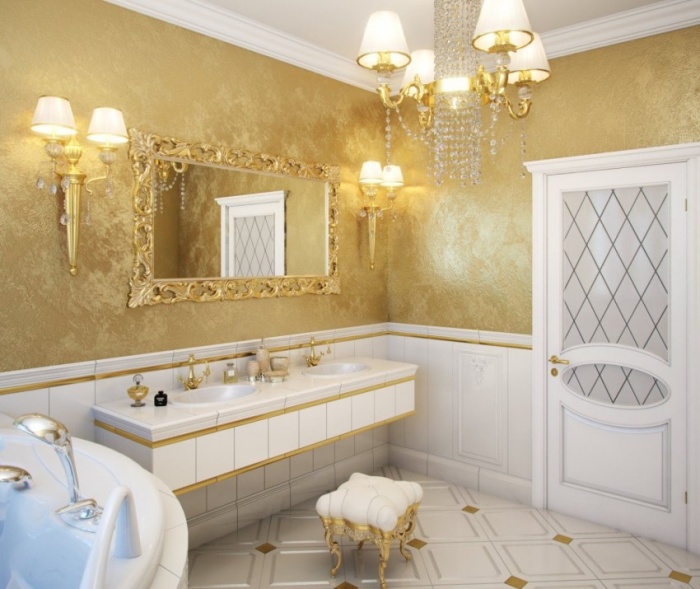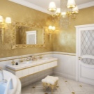 Gips mit einem goldenen Spiel wird dazu beitragen, aus einem vertrauten Badezimmer ein luxuriöses Boudoir zu machen. Wählen Sie einen hellen Farbton, zum Beispiel marmoriert. Als "Begleiter" sollten goldene Reflexionen den gleichen Schatten Accessoires oder Klempner "unter dem Gold" wählen.