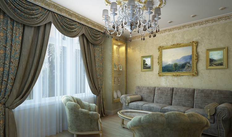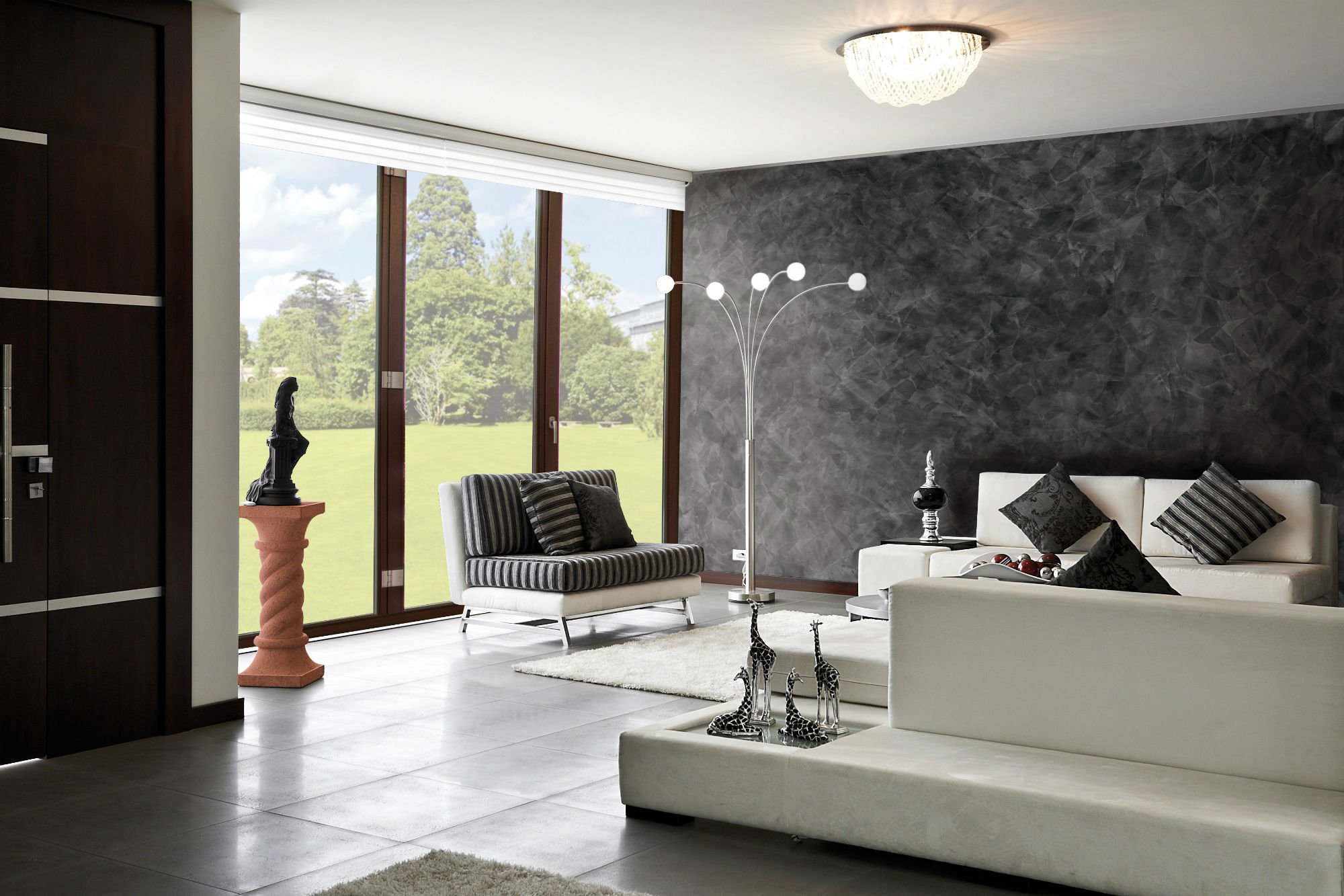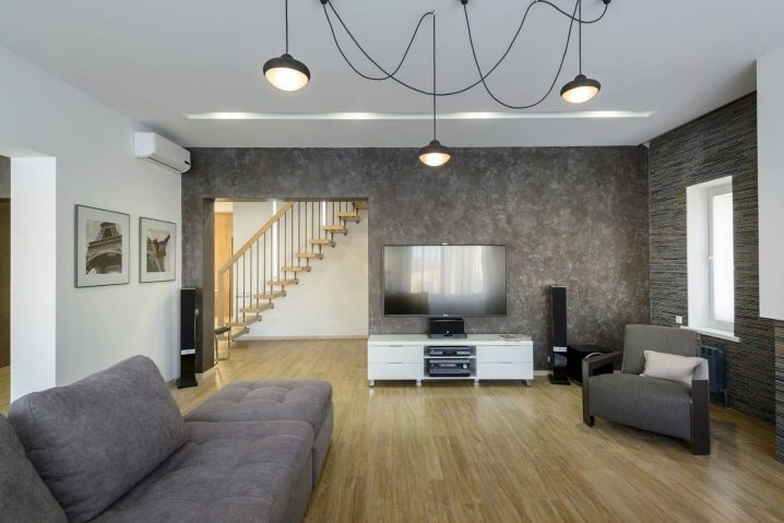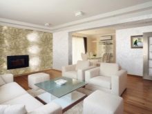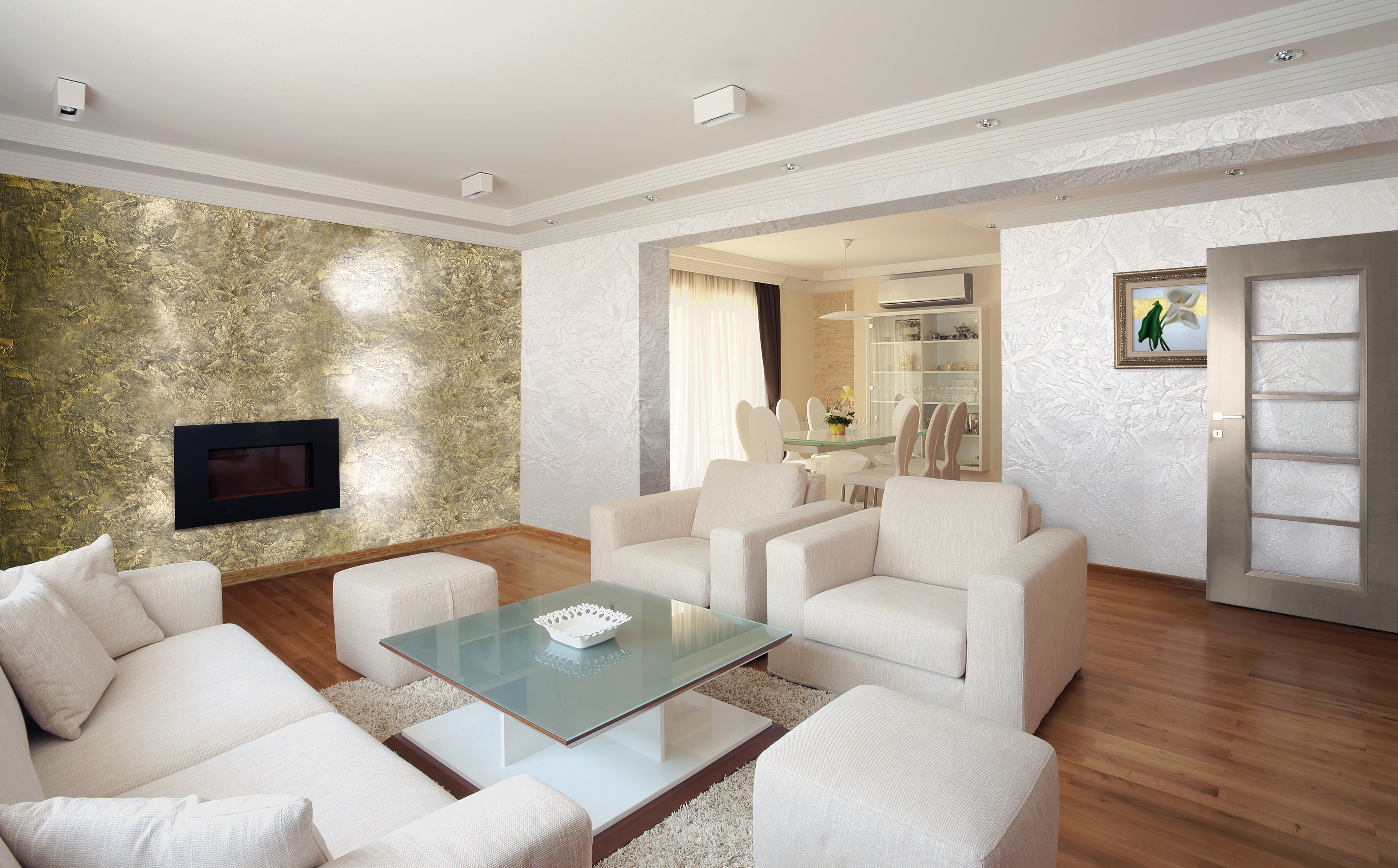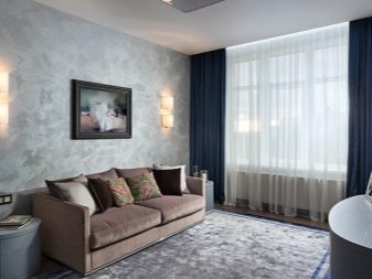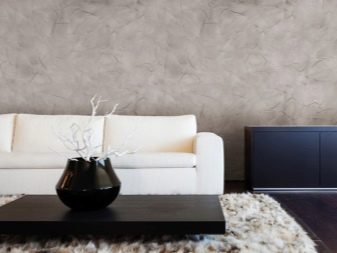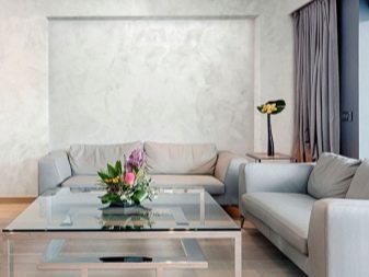 Für das Wohnzimmer im klassischen Stil geeignete feinkörnige Version des Materials in hellen Pastelltönen.Für High-Tech-Stil, sowie minimalistische Interieurs, können Sie einen groben, rauhen Gips, Graphit oder Stahl Schatten wählen. Heller venezianischer Putz ist ein ausgezeichneter Hintergrund für geräumige Wohnzimmer mit viel Licht. Übermäßig aufwendige Designs sollten vermieden werden. Zuerst werden sie natürlich Aufmerksamkeit erregen, aber dann nur Müdigkeit und Irritation verursachen.
