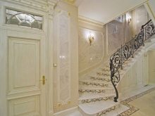 - Stuck mit Marmorkrümeln andere Fraktion. Gewöhnlich verwendet, um bestimmte Bereiche des Innenraums hervorzuheben, ermöglicht es Ihnen, Akzente zu setzen, Aufmerksamkeit auf Details zu lenken.