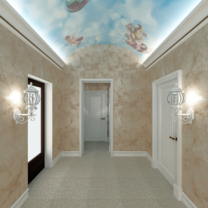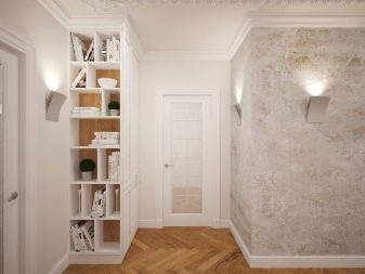 Für den Flur können Sie den gleichen Putz wie für die Halle verwenden. Dies wird es ermöglichen, den Raum stilistisch zu kombinieren, ihn größer zu machen. Für das Finishing können Sie sowohl glatte als auch geprägte Oberflächen wählen. Die Kombination von venezianischem Putz mit anderen Oberflächen wird erfolgreich sein.
