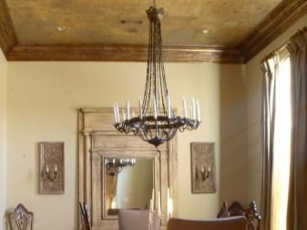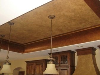 Venezianischer Putz an der Decke ist besonders attraktiv in großen Wohnräumen und Schränken im klassischen Stil. Es ist besser, eine glänzende Komposition von hellen Farbtönen zu verwenden, mit der Sie auch die Decke optisch anheben können.