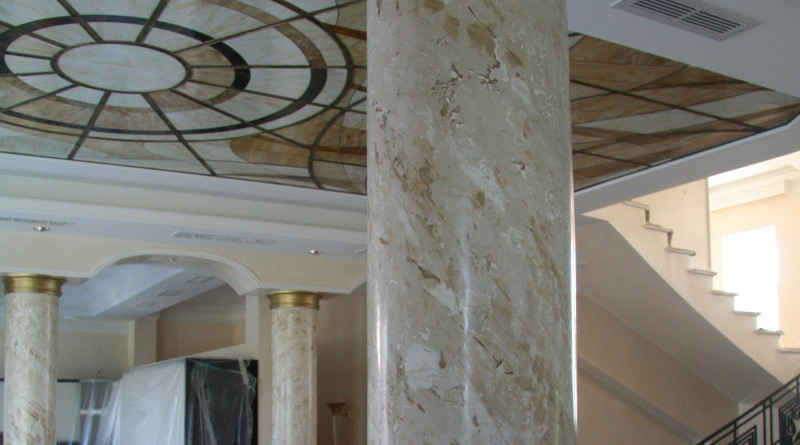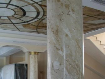 Marmorkrümel sehen nicht nur auf großen Flächen und Wänden gut aus, sondern auch bei der Veredelung von dekorativen Architekturelementen. Zuerst sprechen wir über die Dekoration von Säulen, Vorsprüngen und Portalen von Kaminen. Was die Oberflächen betrifft, wird das beste Material auf einem flachen Mauerwerk, Beton und Trockenbau aufgetragen.