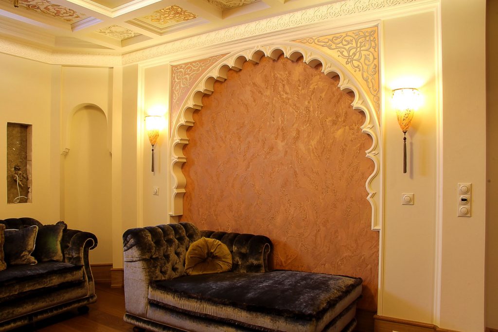 Der wichtige Punkt - die Textur und der Farbton des Putzes sollten dem gesamten Stil des Interieurs entsprechen.