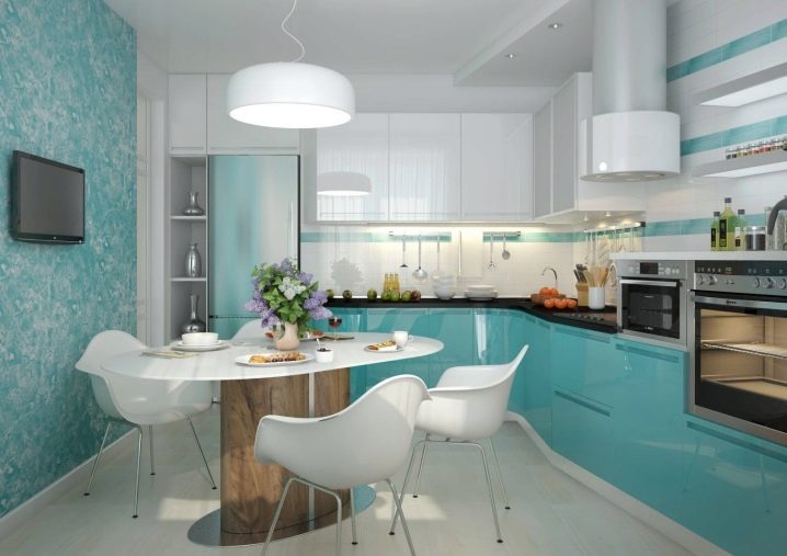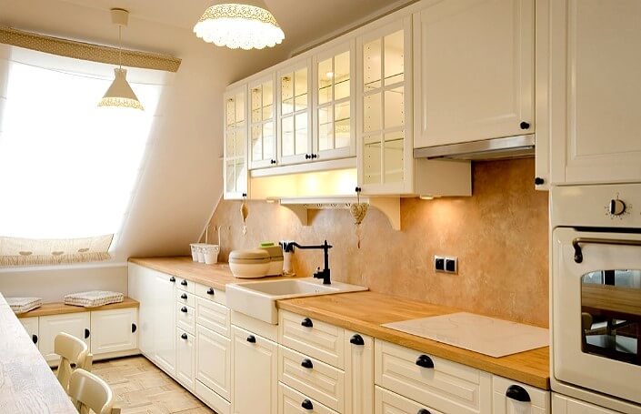 Experten raten davon ab, zu helle Farben in kleinen Küchen zu verwenden., da sie den Raum optisch verengen und aggressiv aussehen. Die Kombination von venezianischem Putz mit Mauerwerk, Stein oder Holzoberfläche wirkt organisch.