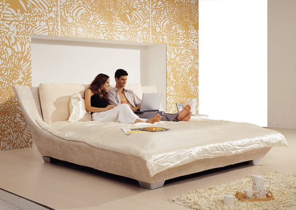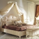 Ein Bett in heller Farbe kann mit Holz-, Metall- oder Kunststoffstrukturen hergestellt werden, die Rückseite des Bettes ist oft mit MDF oder Polsterung versehen.Manchmal ist das Kopfteil verlängert, so dass es als Regal dient. Auf diesem kleinen Bereich können Sie die Accessoires in den gleichen Stil, Bücher oder Beleuchtung arrangieren.